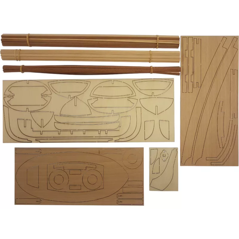 W zestawie znajdują się części potrzebne do zbudowania modelu - części cięte laserowo, listwy, mosiężne naklejki fotograficzne, liny i wiele innych.