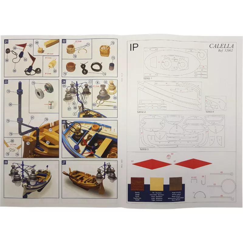 Zestaw konstrukcyjny modelu statku niepływającego Calella firmy OCCRE w skali 1:15. Zestaw zawiera części do budowy – elementy wycinane laserowo, listwy, mosiężne naklejki ze zdjęciami, olinowanie i wiele innych. Rysunki konstrukcyjne i instrukcje.