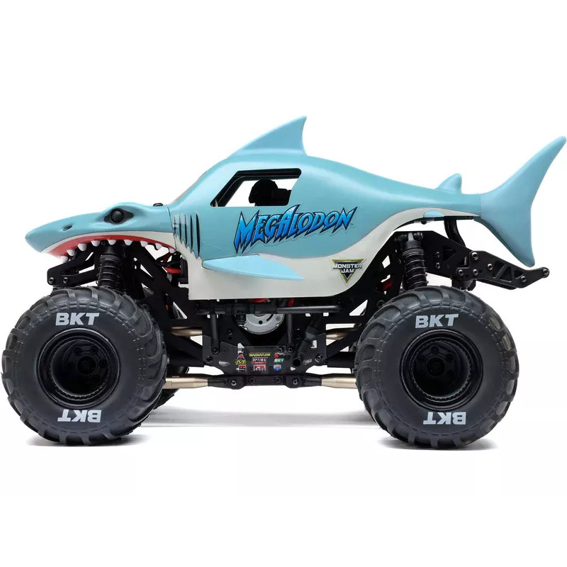 Oszałamiający korpus w kształcie rekina kryje w sobie bogactwo detali, łącznie z wnętrzem, i został specjalnie zaprojektowany, aby zapewnić niekończącą się zabawę. Zamiast tradycyjnego procesu formowania próżniowego poliwęglanu, zespół Losi stworzył ciało Megalodona z kompozytu formowanego wtryskowo. Płetwy wykonane są z trwałej gumy w dopasowanym kolorze, dzięki czemu są odporne na wstrząsy i mocne uderzenia. Megalodon ma także całkowicie wyjmowaną klatkę z praktycznym mechanizmem blokowania za pomocą przekręcanego zatrzasku z przodu i z tyłu.