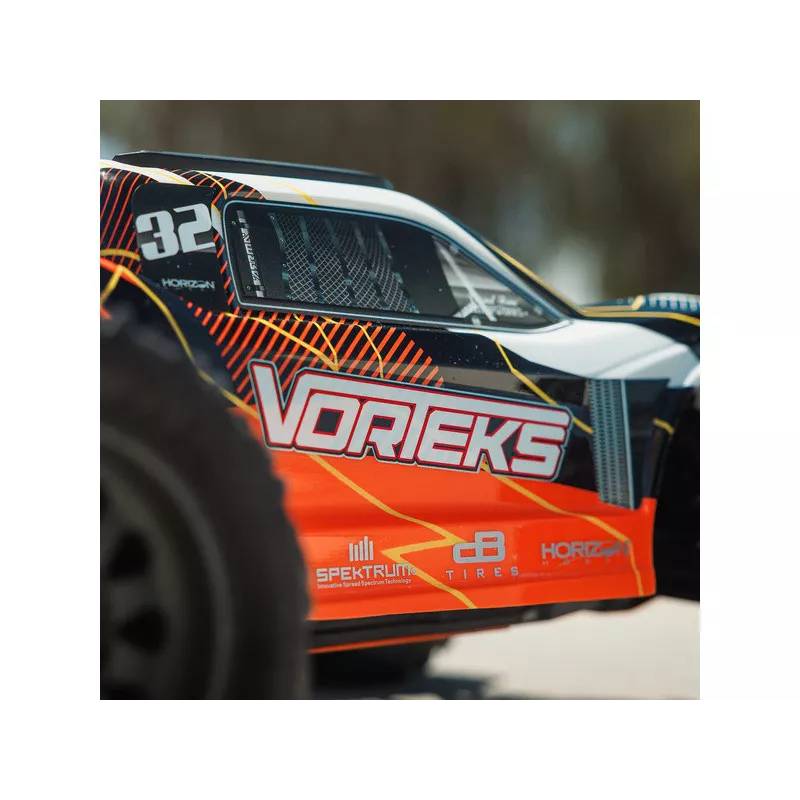 Vorteks ma szeroki rozstaw kół zapewniający stabilne prowadzenie. Niskie sportowe zawieszenie pozwala na pokonywanie zakrętów z dużą prędkością. Model nadaje się na twarde nawierzchnie, żwir i niską trawę. Kompozytowe podwozie wytrzymuje nawet mocne uderzenia. Zastosowane metalowe przekładnie są wystarczająco trwałe, nawet w przypadku ewentualnej modernizacji do napędu prądu przemiennego. Specjalna konstrukcja bieżnika nowych przednich opon dBoots Dirtrunner ST ułatwia skakanie i skręcanie na nierównych nawierzchniach.