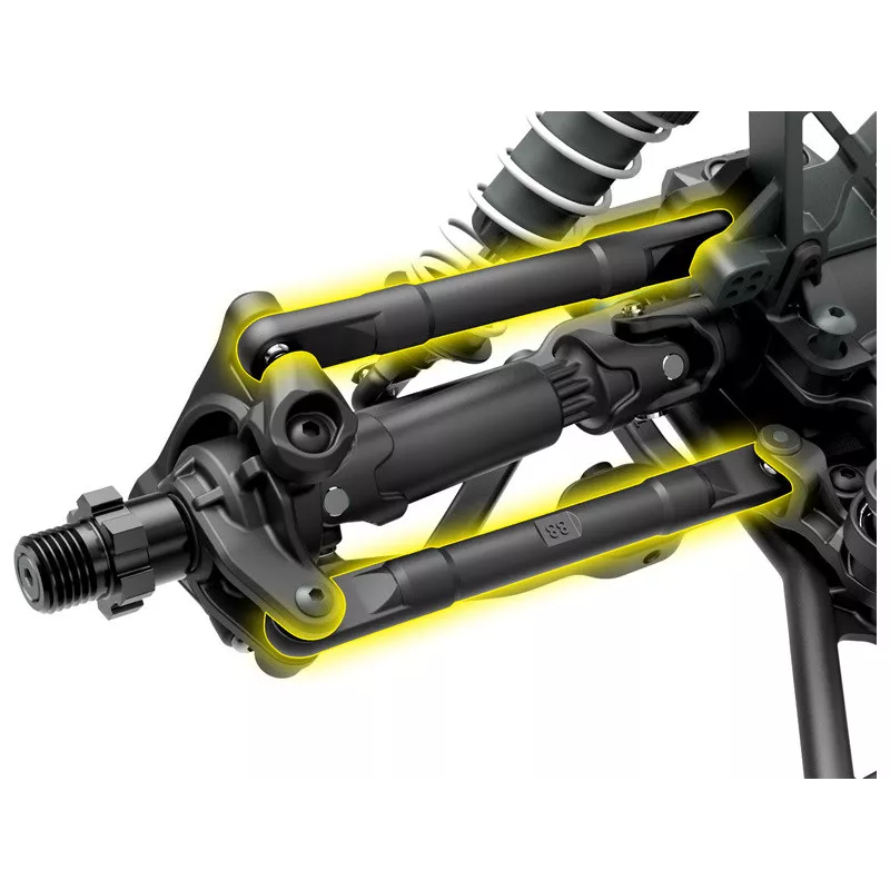 Dlhý zdvih ramien tlmí aj prudké nárazy a zlepšuje ovládateľnosť modelu. V každej situácii tak bude mať presnú a rýchlu odozvu riadenia, vďaka maximálnemu kontaktu s podkladom.