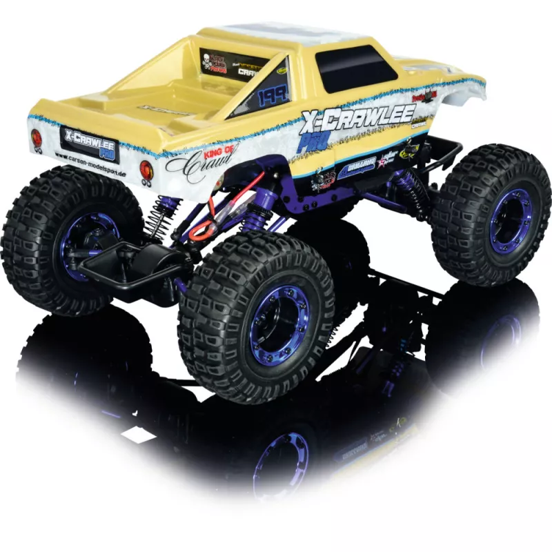 Tento krásne a kvalitne spracovaný stroj, ultraľahký X-Crawlee PRO 1:10 sa po rozbalení premení na plne funkčné terénne vozidlo s pohonom všetkých štyroch kolies. Vďaka radikálne sklopeným nápravám, tuhým hnacím hriadeľom a skrutkovaným pneumatikám s beadlock (skrutkovacím) systémom Crawler prekonáva takmer každú prekážku. Model má mnoho modro eloxovaných duralových dielov, ako sú spojovacie tyče riadenia, unášače náprav, šasi. Nastaviteľné olejové tlmiče, ktoré znižujú hmotnosť a spoločne s robustnou polykarbonátovou karosériou vytvárajú naozaj "COOL" vzhľad. Silné riadiace servo CS-6 s ťahom 6 kg a guľôčkové ložiská. Všetky tieto vlastnosti zaručujú neuveriteľne intenzívny zážitok z riadenia.