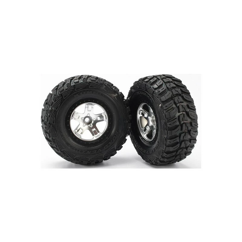 Kompletné predné kolesá pre 2WD autá Traxxas Slash. Saténové disky s čiernymi ráfikmi Bead Lock s nalepenými pneumatikami Kumho (mäkká zmes) a vložkou.