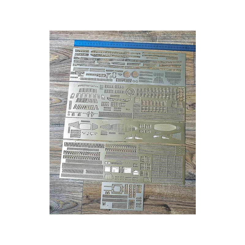 Balenie obsahuje laserom rezané drevené diely, planky, paluby, stožiare, 3D tlačené diely, dekorácie, mosadzné kovanie, nite, maketové súčasti. Podrobný obrázkový manuál s anglickým popisom EN a stavebné plány.