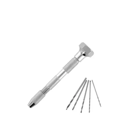Modelcraft mini ručná vŕtačka s 5 vrtáky na presné práce s malými vrtáky. V balení sú vrtáky 1mm; 1,2mm; 1,4mm; 1,5mm a 1,8mm a 2 klieštiny s upínacím rozpätím 0-1,2 mm, & 1,3-2,4 mm a 0,8-2,0